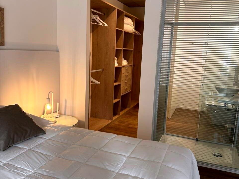 Dormitorio principal en suite, con ventanal y vista abierta. Cuenta con un vestidor independiente transitable (walk-in closet) que optimiza el almacenamiento. El baño principal presenta terminaciones modernas, ducha con mampara de vidrio y detalles de grifería de calidad.